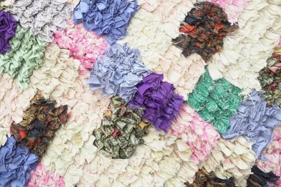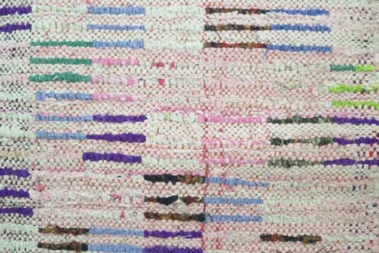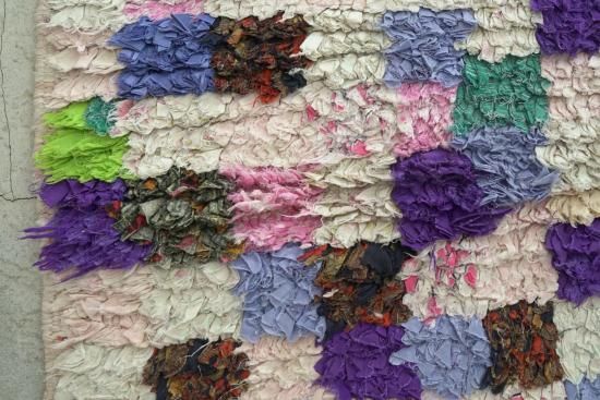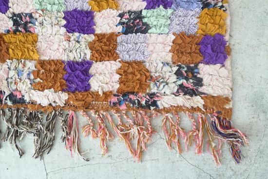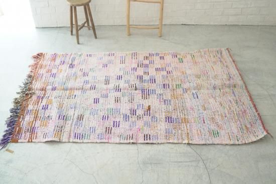 ボシャルウィットは、使えなくなった衣類やカーテンなどの布切れを裂いて作られたモロッコのリサイクルラグです。大切に長く使われてきたものから感じとれる、古さの良さが溢れたラグ。デザイン、配色など一枚一枚がどれも独創的で美しく、敷物としてはもちろん、モロッコでは、アートとして、ボシャルウィットを壁に飾っているシーンもよく見かけます。